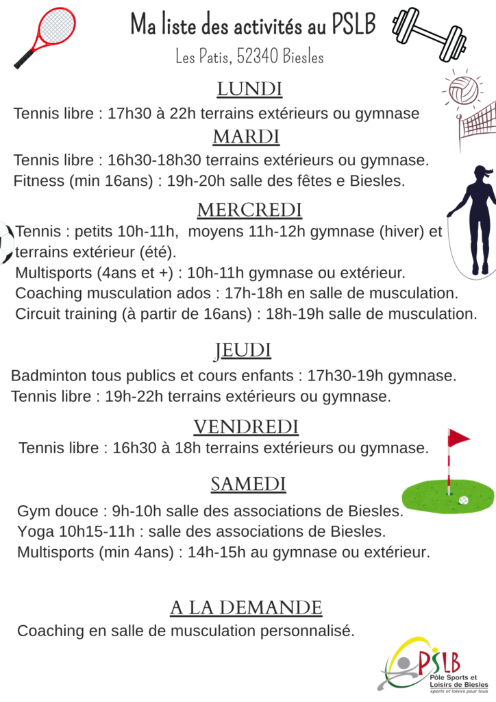 Voici toutes les activités proposés à la semaine. Pour rappel, lorsque vous adhérez au Pôle Sports et Loisirs de Biesles, vous avez la possibilité de participer à autant de cours que vous le souhaitez pour le même prix !